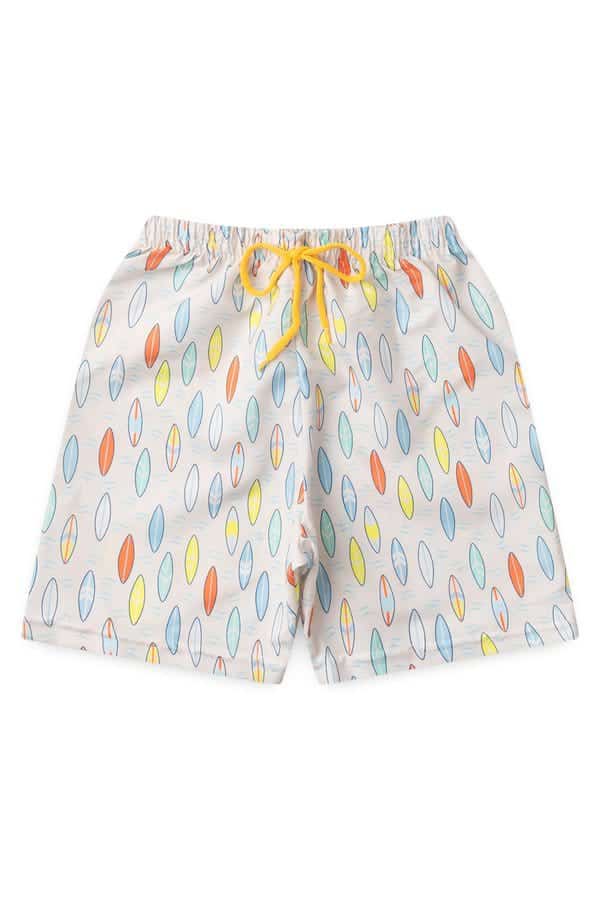 Bermuda em tactel estampado, possui elástico no cós e aplique de cordão.