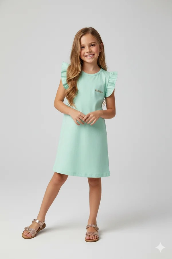 Vestido Infantil Verão Feminino Faella – Verde Vestido em meia malha na cor verde, possui mangas em babados e plaquinha faella, super estiloso. vista sua pequena com estilo, conforto e qualidade. Aproveite!